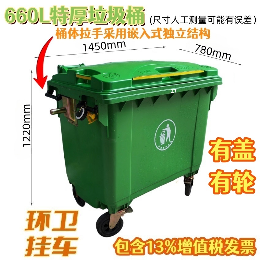特厚660L塑料垃圾桶、660升环卫垃圾桶,四轮移动式垃圾桶,环卫车挂钩吊挂使用。